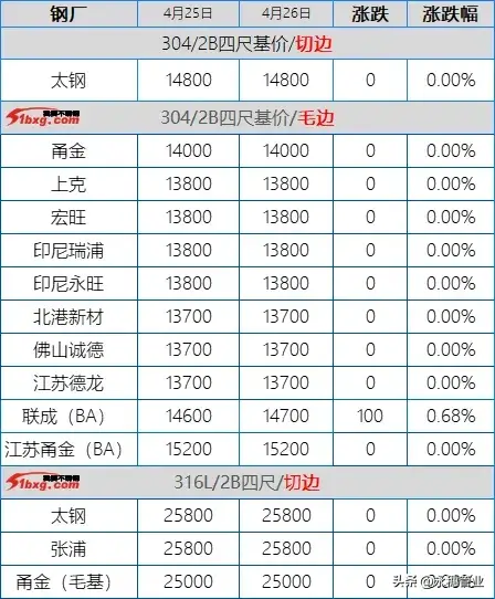 今日,青山代理持平報(bào)4-5月期貨,鼎信304冷軋窄帶13600元/噸,30478冷軋窄帶13100元/噸,304熱軋大板13630元/噸,30478熱軋大板13100元/噸。