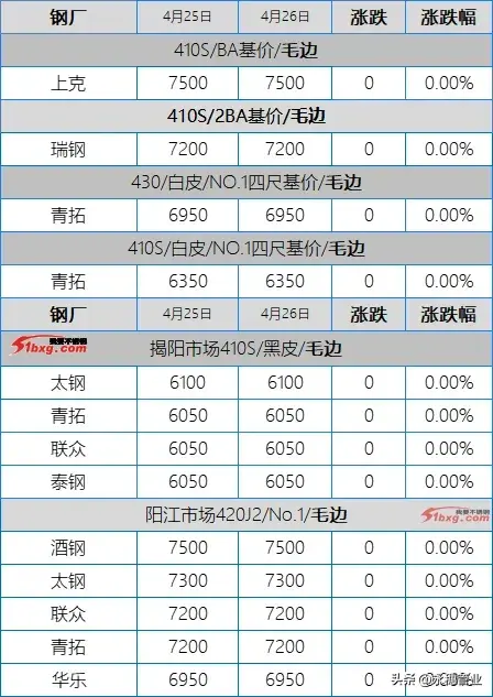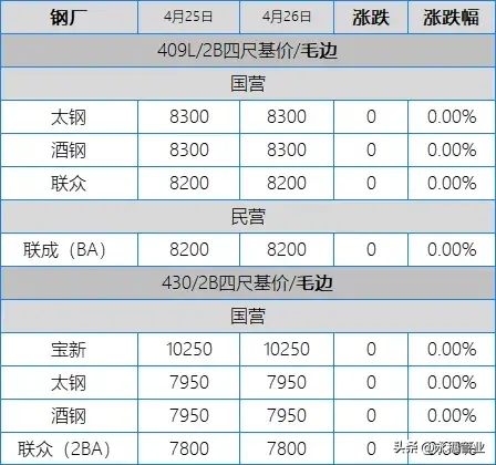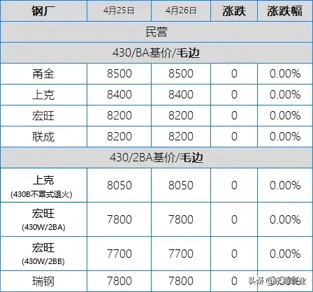 目前市場主流報(bào)價(jià):410S熱軋黑皮在6050-6150元/噸;430熱軋黑皮在6650-6750元/噸,其中個(gè)別高位在6800元/噸左右;太鋼/酒鋼430/2B(毛)在7950-8000元/噸;聯(lián)眾430/2BA(毛)在7750-7800元/噸;宏旺430/2BA(毛)在7750-7800元/噸;甬金430/BA(毛)在8500元/噸左右;上克430/BA(毛)在8400元/噸左右;宏旺430/BA(毛)在8150-8200元/噸;瑞鋼430/2BA(毛)在7700-7800元/噸;聯(lián)成430/BA(毛)在8200元/噸左右。