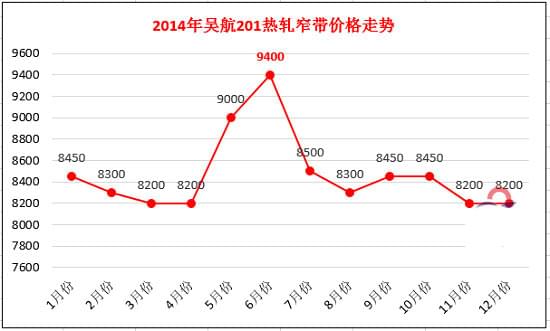 在國內(nèi)所有生產(chǎn)不銹鋼熱軋窄帶的民營鋼廠當(dāng)中,主要的鋼種是201。以吳航201熱軋高銅料為例,價格在6月份達(dá)到了全年的頂峰,為 9400元/噸。隨后出現(xiàn)下滑,后停留在8200元/噸,為2014年畫上了句號。其中,2014年吳航201熱軋窄帶價格走勢如下圖所示: