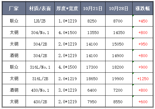 304市場同樣陷入“洶漲”模式,單日漲幅高達300~500元/噸,甚至出現了單日多次調漲的現象。短短幾天的時間,基價已有超出了15000元/噸。316L冷熱軋產品的漲勢也十分火爆,周間漲幅也有達1000元以上。430價格也同時逃不出漲價氣氛,太鋼市場價格已經直指8550!