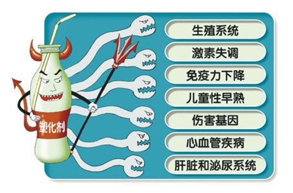 聯(lián)苯酚A(Bisphenol):有雌性荷爾蒙化學(xué)物質(zhì)反應(yīng),乳腺癌細(xì)胞呈異常增殖;鄰苯二甲酸酯(DEHP,BBP,DBP):對(duì)精巢具有毒性;肝臟癌細(xì)胞呈異常增殖;聚乙烯(Polystyrene):引起婦女體內(nèi)荷爾蒙增加;聚氯聯(lián)苯(PCB):環(huán)境荷爾蒙的主要成員,燃燒以后產(chǎn)生二惡英。