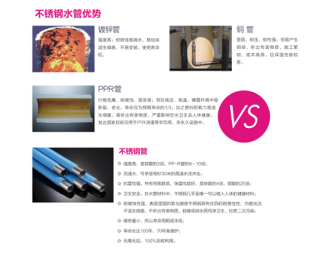 4.衛(wèi)生安全,在水管材質(zhì)中,不銹鋼是公認可以植入人體的健康材料;