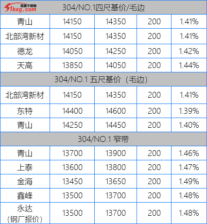 從報(bào)價(jià)來看,市場(chǎng)多次調(diào)漲報(bào)價(jià)后,整體累計(jì)漲200-300元/噸。從成交來看,304不銹鋼水管市場(chǎng)貿(mào)易商反饋出貨尚可,如大板的一些較好規(guī)格于早上已被“搶走”,個(gè)別產(chǎn)地現(xiàn)貨有缺,但市場(chǎng)貿(mào)易商反饋稱,北部灣新材資源在下周有到貨,今日訂貨能優(yōu)價(jià)。看來,市場(chǎng)還是要在漲價(jià)的時(shí)候才有買賣的動(dòng)力。另外,青山鋼廠雖然未對(duì)304熱軋啟動(dòng)新盤價(jià),但是有消息稱,鋼廠允許代理以成本價(jià)14300元/噸補(bǔ)點(diǎn)大板現(xiàn)貨!