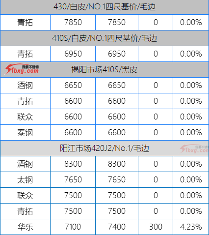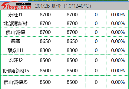 今日,青山代理報(bào),J1-8150元/噸,J3-7950元/噸,J4-8650元/噸,J2-7750元/噸,交貨期仍是3月10日前。市場(chǎng)貿(mào)易商整體報(bào)價(jià)波動(dòng)不大,但價(jià)格依然有高低不一呈現(xiàn)。可見報(bào)價(jià)有,鼎信J2不含稅報(bào)價(jià)7120-7150元/噸;北部灣新材報(bào)J5料7700元/噸,J1四尺8100元/噸,J1五尺8200-8250元/噸(期貨8150);寶鋼BN1TL窄帶7600元/噸,大板7700元/噸;中金J3含稅7530-7550元/噸;中金J5料、金海J3料、鑫峰J3料、永達(dá)J3料7380-7500元/噸。